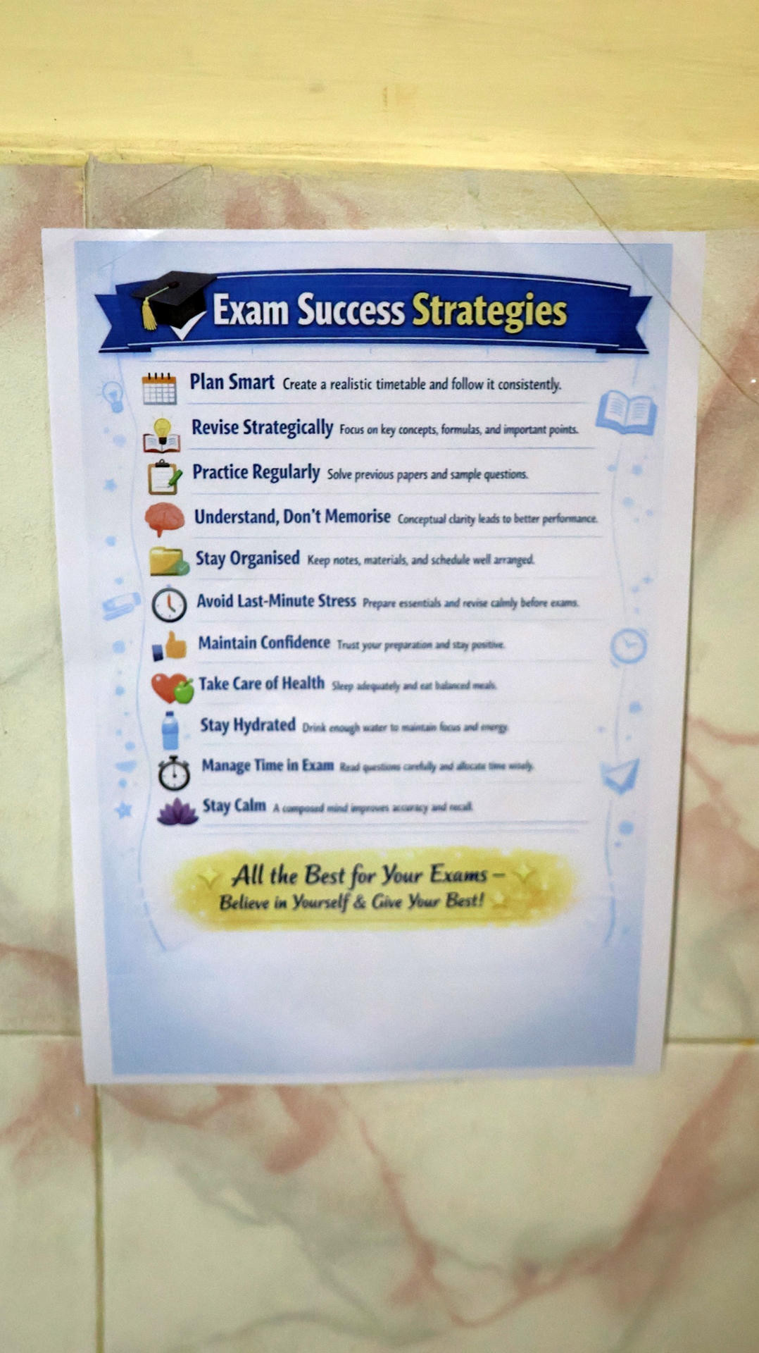 The posters highlighted practical tips such as time management, positive thinking, healthy study habits, prayer and relaxation techniques to help students manage examination stress effectively.